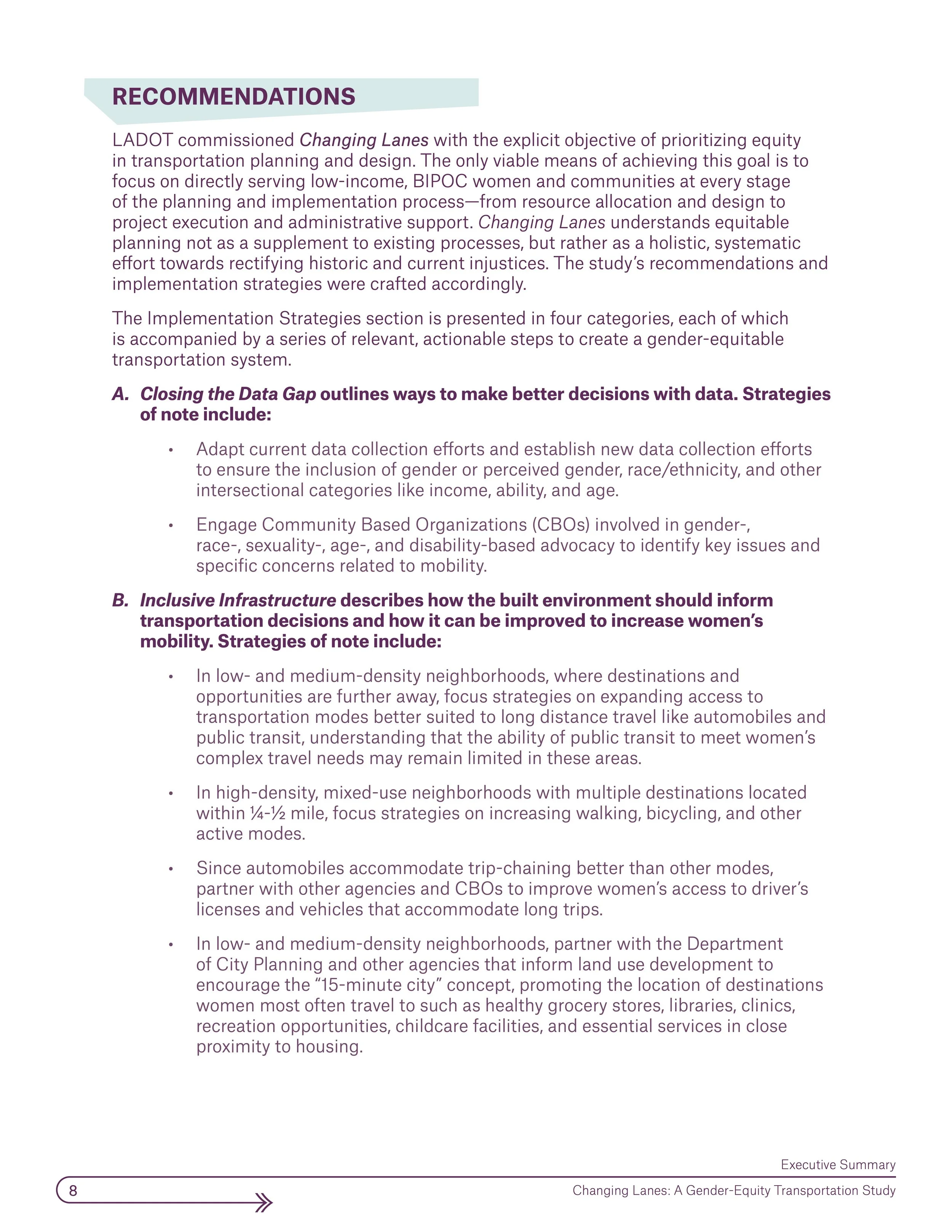 Changing Lanes: A Gender Equity Transportation Study uses a lens of intersectionality to envision gender-equitable transportation systems and policies that support accessible, efficient, flexible, and affordable mobility solutions for Angelenos of all genders. In turn, a gender-inclusive transportation system in Los Angeles also creates opportunities for economic development, drives progress on racial justice, and contributes to overall health and wellness.